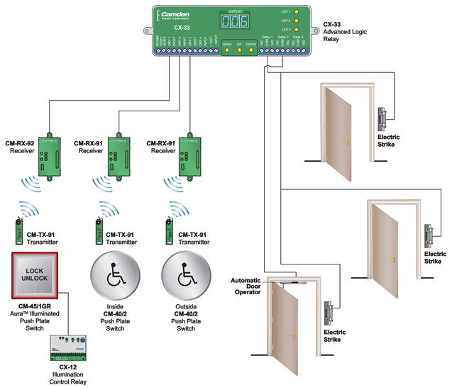 Cuando el histórico Teatro Imperial en Saint John, New Brunswick buscó actualizar su sistema de control de acceso, recurrió a la experiencia del integrador Philip Bourque, Gerente de División de Royal Door Ltd., con sede en New Brunswick, y su equipo El teatro, que abrió sus puertas en 1913 y ha sido calificado como el mejor teatro del este de Canadá, tenía dos objetivos en mente. Una era permitir la accesibilidad de sillas de ruedas al edificio con un operador de puerta de bajo consumo. El otro era permitir a los empleados asegurar fácilmente tres puertas de entrada principales de forma remota, desde detrás del mostrador de recepción. Debido a que el teatro se clasifica como un edificio patrimonial, Bourque no pudo perforar las paredes para pasar los cables. "No podíamos pasar cables a través de las paredes o los techos para llegar a los interruptores, así que tuvimos que hacer una instalación inalámbrica", explica. "Necesitábamos desbloquear y bloquear tres cerraduras eléctricas (simultáneamente) desde detrás del mostrador e indicar el estado de la cerradura, para que el personal siempre sepa si las cerraduras están bloqueadas o desbloqueadas". Por supuesto, el automatismo automático para puertas también debe desactivarse cuando las cerraduras de las puertas están bloqueadas. "En consecuencia, necesitábamos un relé adicional para que cuando bloquee la cerradura, también desactive los interruptores de activación que controlan el operador de la puerta", agrega, "Ahí es donde se complicó. En última instancia, se necesitaba un interruptor inalámbrico para abrir y cerrar la puerta, mientras que se necesitaba otro interruptor inalámbrico para bloquearla y desbloquearla". El mayor desafío, señala Bourque, fue encontrar la solución inalámbrica adecuada para satisfacer la solicitud del teatro de esta combinación de accesibilidad, control de acceso y facilidad de uso para su personal. Camden Door Controls fue la primera opción para el equipo debido a su liderazgo en el mercado en el suministro de soluciones y productos inalámbricos llave en mano que abarcan tanto ADA como sistemas de control de acceso. Para esta aplicación, Bourque eligió un Camden Aura? Placa de empuje iluminada por LED para bloquear/desbloquear la cerradura de la puerta de entrada y anunciar el estado de la cerradura porque proporcionó la comodidad de una gran placa de empuje ADA con una indicación muy visual del estado de la cerradura. Nota del editor: Alternativamente, un interruptor de llave con LED rojo/verde proporcionaría un medio seguro para bloquear/desbloquear las puertas o un botón de hongo con LED proporcionaría la misma funcionalidad general en un tamaño más pequeño. ¿Aura? Los interruptores de placa de empuje ofrecen iluminación verde/roja/apagada seleccionable en campo, que se activa directamente (mediante un interruptor) o de forma remota (mediante un relé de control o un sistema de control de acceso). ¿Bourque eligió el Lazerpoint RF de Camden? transmisores y receptores inalámbricos de espectro ensanchado de 915 Mhz. para la interconexión del operador de la puerta, interruptores de placa de empuje 'push to open' y Aura? Interruptor de placa de empuje de bloqueo / desbloqueo. ¿Lazerpoint RF? ofrece las comunicaciones inalámbricas más avanzadas disponibles en la actualidad y los transmisores que funcionan con baterías proporcionan la increíble cantidad de 500,000 operaciones utilizando baterías alcalinas 'AAA' estándar. Camden también proporcionó control de relés para el sistema. Se utilizó un relé lógico avanzado CX-33 como controlador para la puerta automática, con 3 entradas de interruptor (conectadas de forma inalámbrica) y 3 salidas de cerradura eléctrica. El CX-33 es un controlador de puerta de última generación con 14 modos de funcionamiento, diseñado para proporcionar soporte "universal" para prácticamente cualquier proyecto. Además, se utilizó un relé de control CX-12 para bloquear la iluminación del Aura? Interruptor de placa de empuje de bloqueo / desbloqueo.