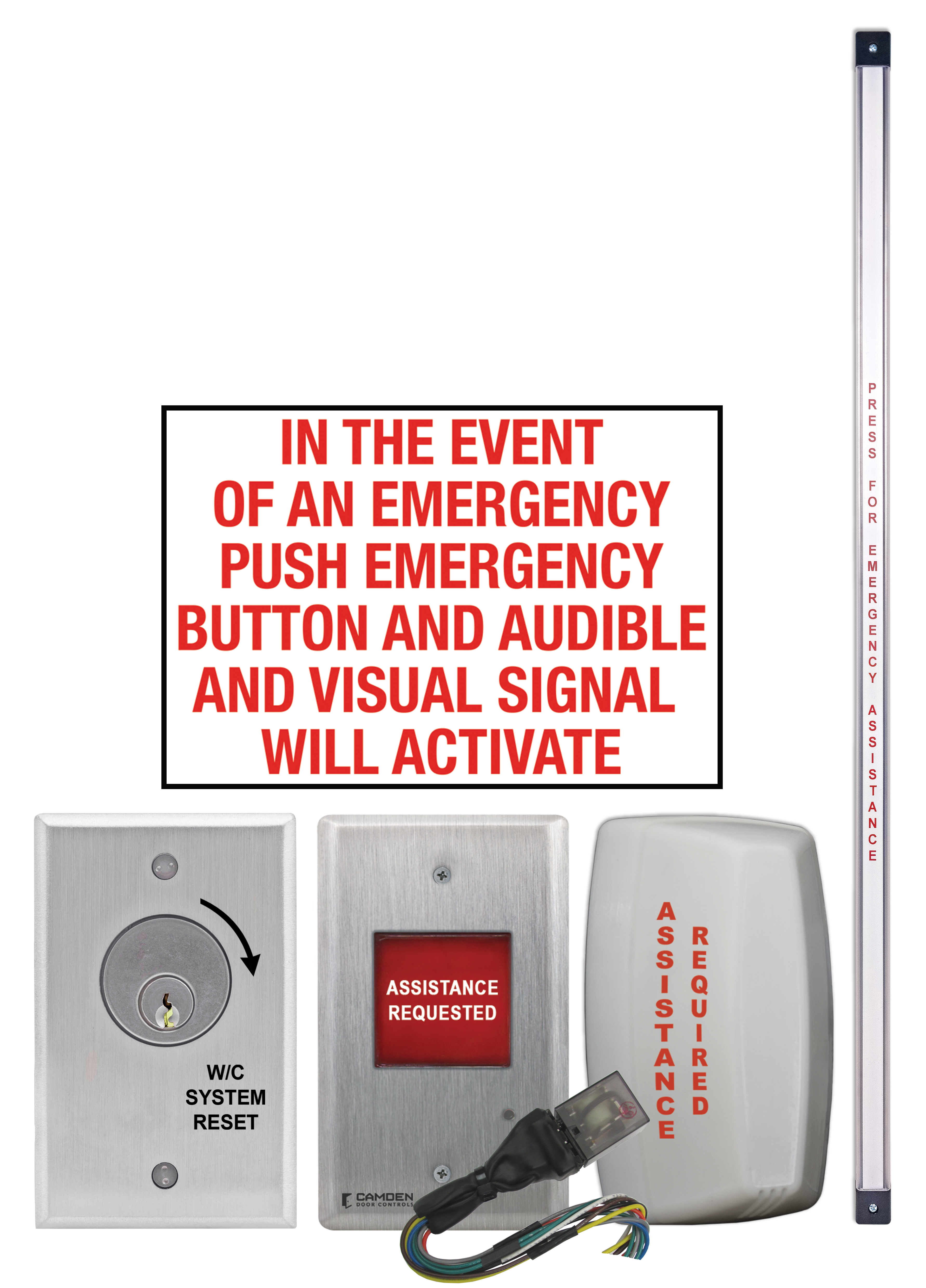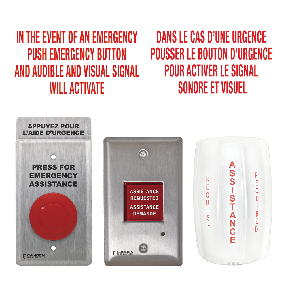 Kits de sistemas de llamada de emergencia de la serie CX-WECLa serie CX-WEC de Camden es un paquete de equipos diseñado para cumplir con los últimos requisitos del código de construcción para baños universales. Los kits de llamada de emergencia para baños universales se pueden instalar en baños sin un operador de puerta automática o con los kits de baños sin barreras de la serie CX-WC (con operador).