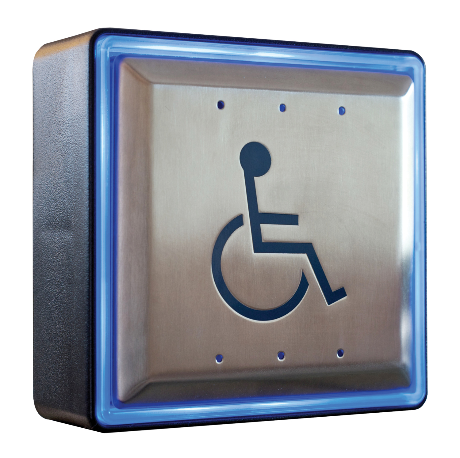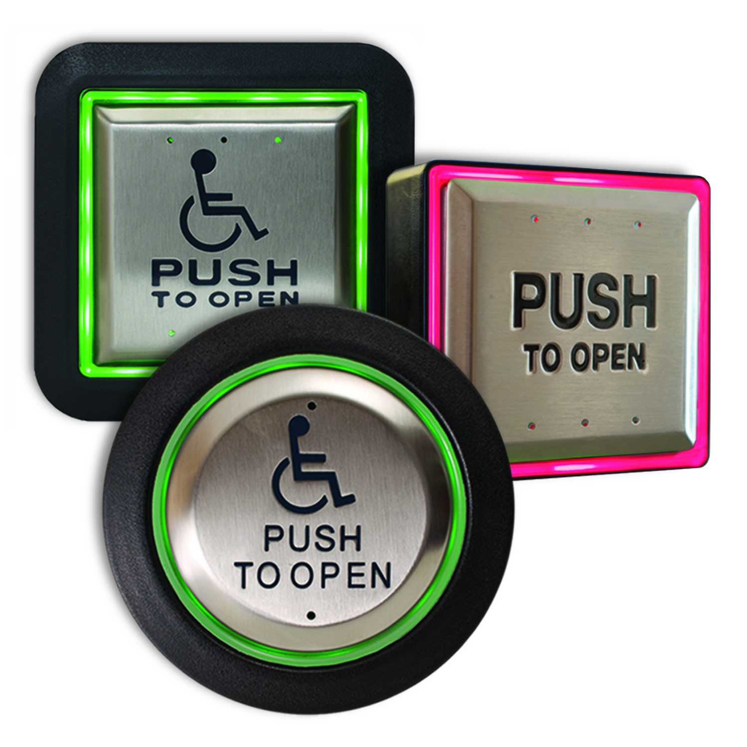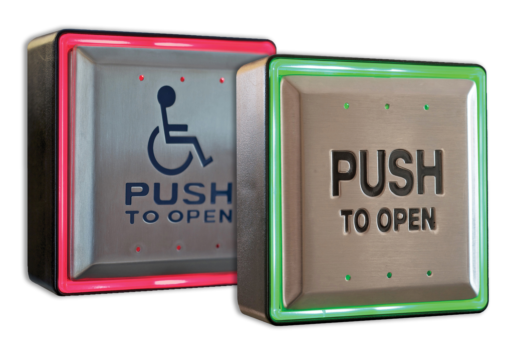 Los gabinetes de placa de empuje iluminados y los kits de interruptores Aura ™ , CM-54 (cuadrado de superficie), CM-55 (cuadrado empotrado) y CM-57 (redondo empotrado) brindan alta visibilidad y mayor comodidad para el usuario en puertas automáticas que cumplen con la ADA y otras aplicaciones.