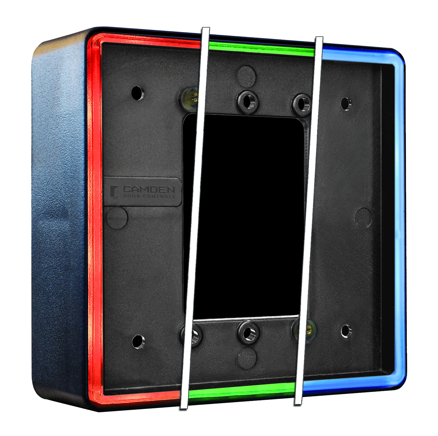 Placa de empuje cuadrada de 4-1/2" (tornillos ocultos) con sirena, caja CM-54i de montaje en superficie ROJO/VERDE/AZUL iluminada