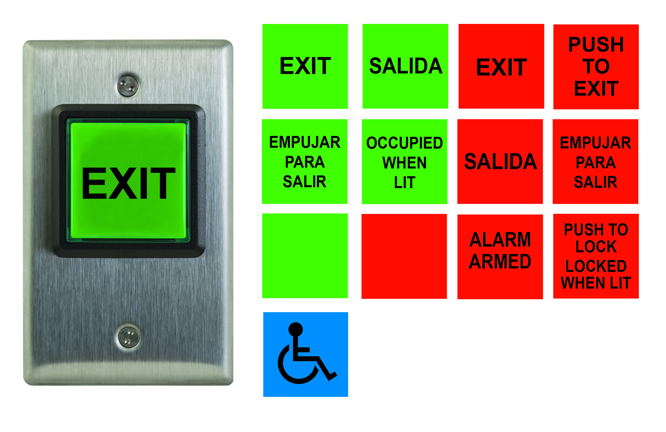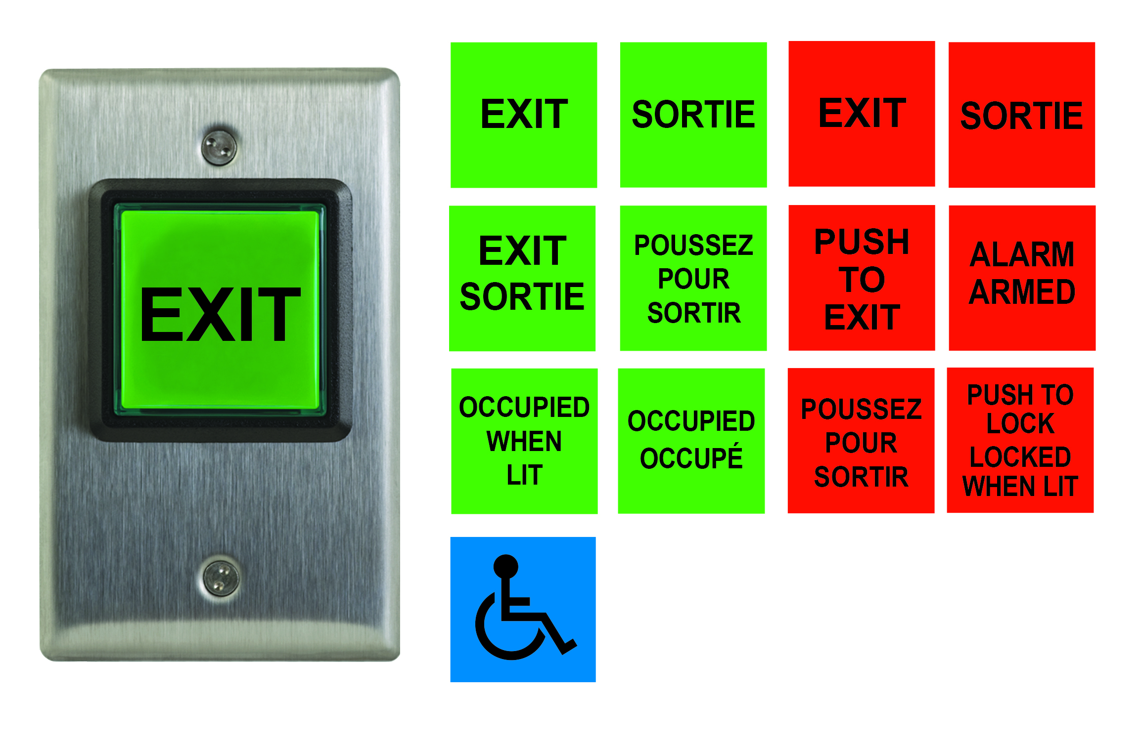 (20) Etiquetas de inserción en inglés, francés y español, 12V - 28V LED Illuminated (Rojo y verde): 'Empujar para salir', 'Salir', 'Ocupado cuando está encendido' y símbolo de silla de ruedas.