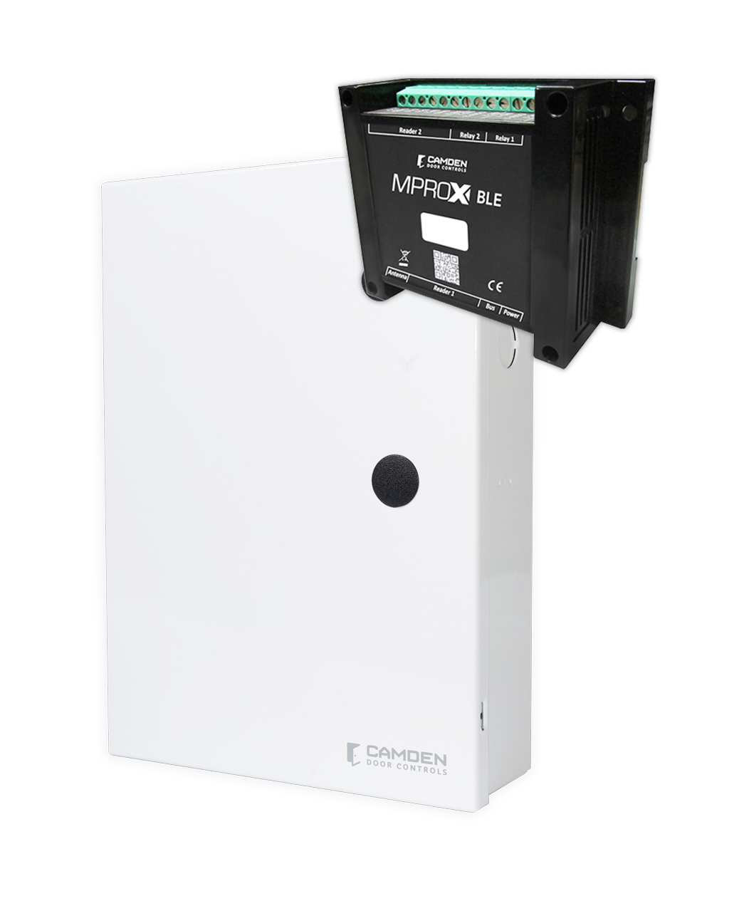 Gabinete con controlador MProx-BLE, fuente de alimentación de 12 VDC, transformador, (1) lector de protocolo AWID/HID CV-7400 y (1) etiqueta de proximidad de protocolo HID 60-21C003