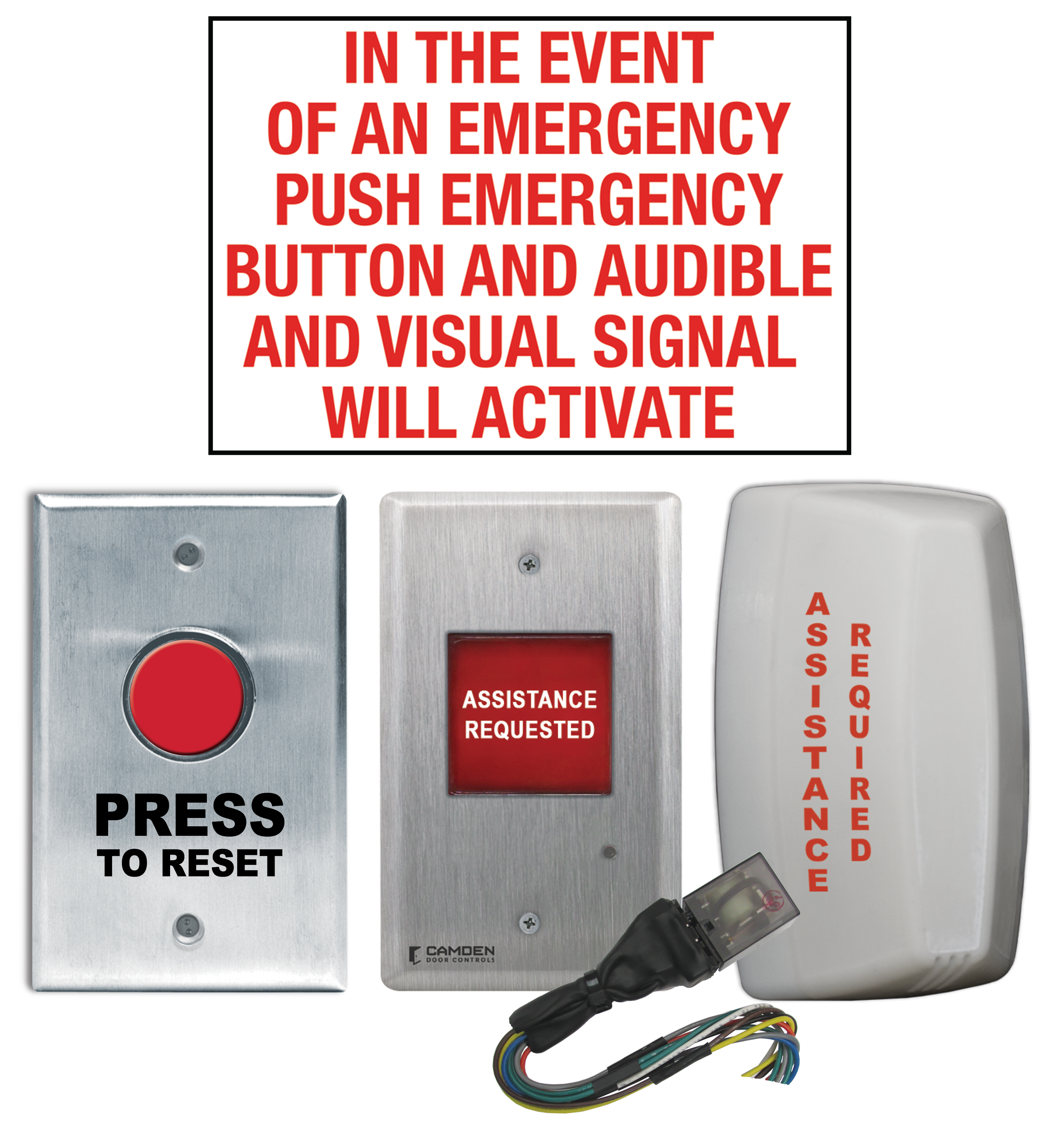 Kits de sistemas de llamada de emergencia de la serie CX-WECLa serie CX-WEC de Camden es un paquete de equipos diseñado para cumplir con los últimos requisitos del código de construcción para baños universales. Los kits de llamada de emergencia para baños universales se pueden instalar en baños sin un operador de puerta automática o con los kits de baños sin barreras de la serie CX-WC (con operador).