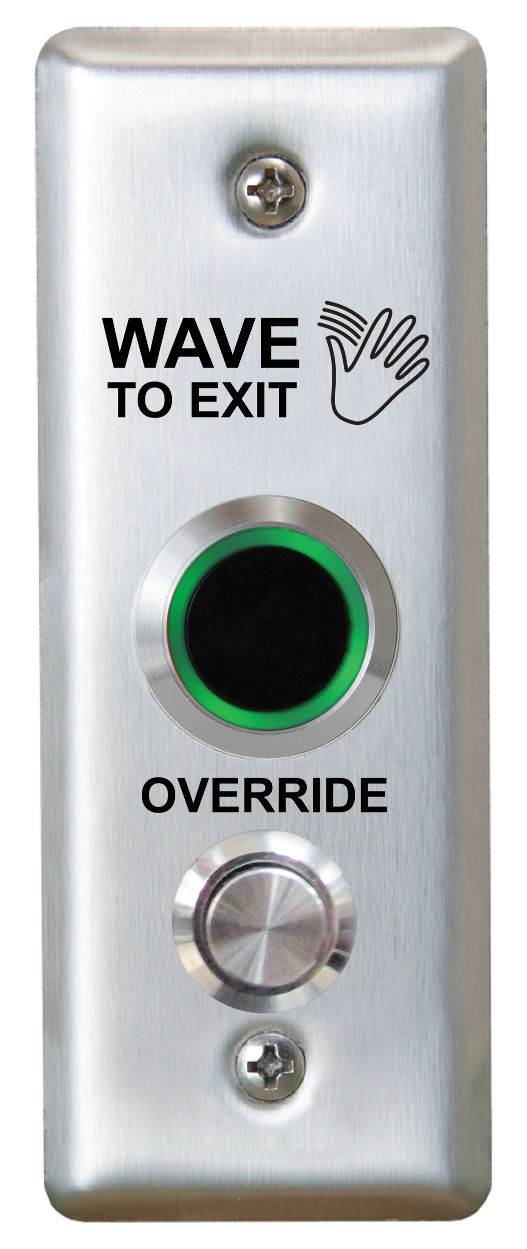 Interruptor sin contacto ValueWave™, estrecho (jamba), gráficos 'Wave to Exit'. Caja de montaje en superficie compatible CM-23D. Iluminación roja/verde.