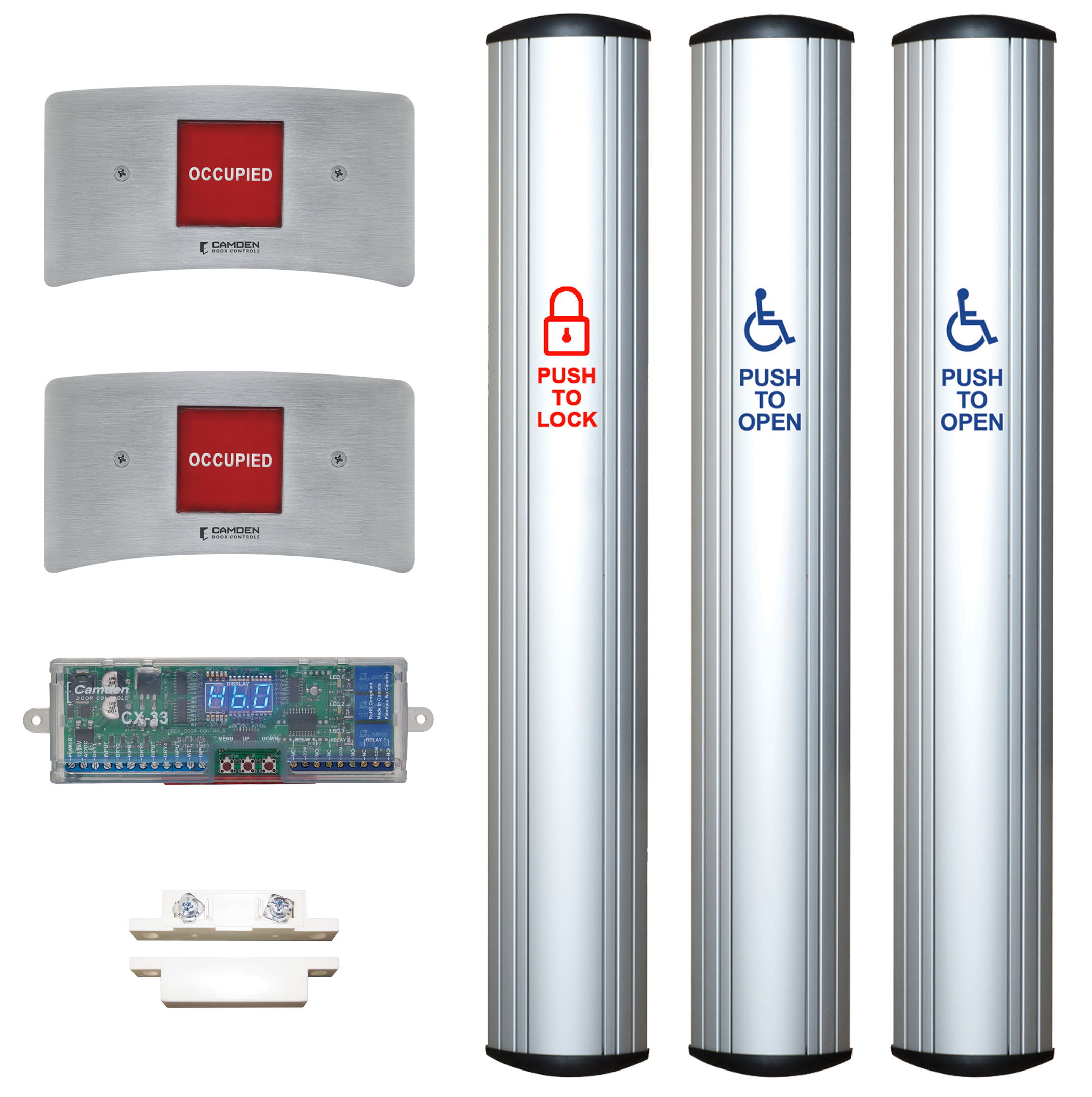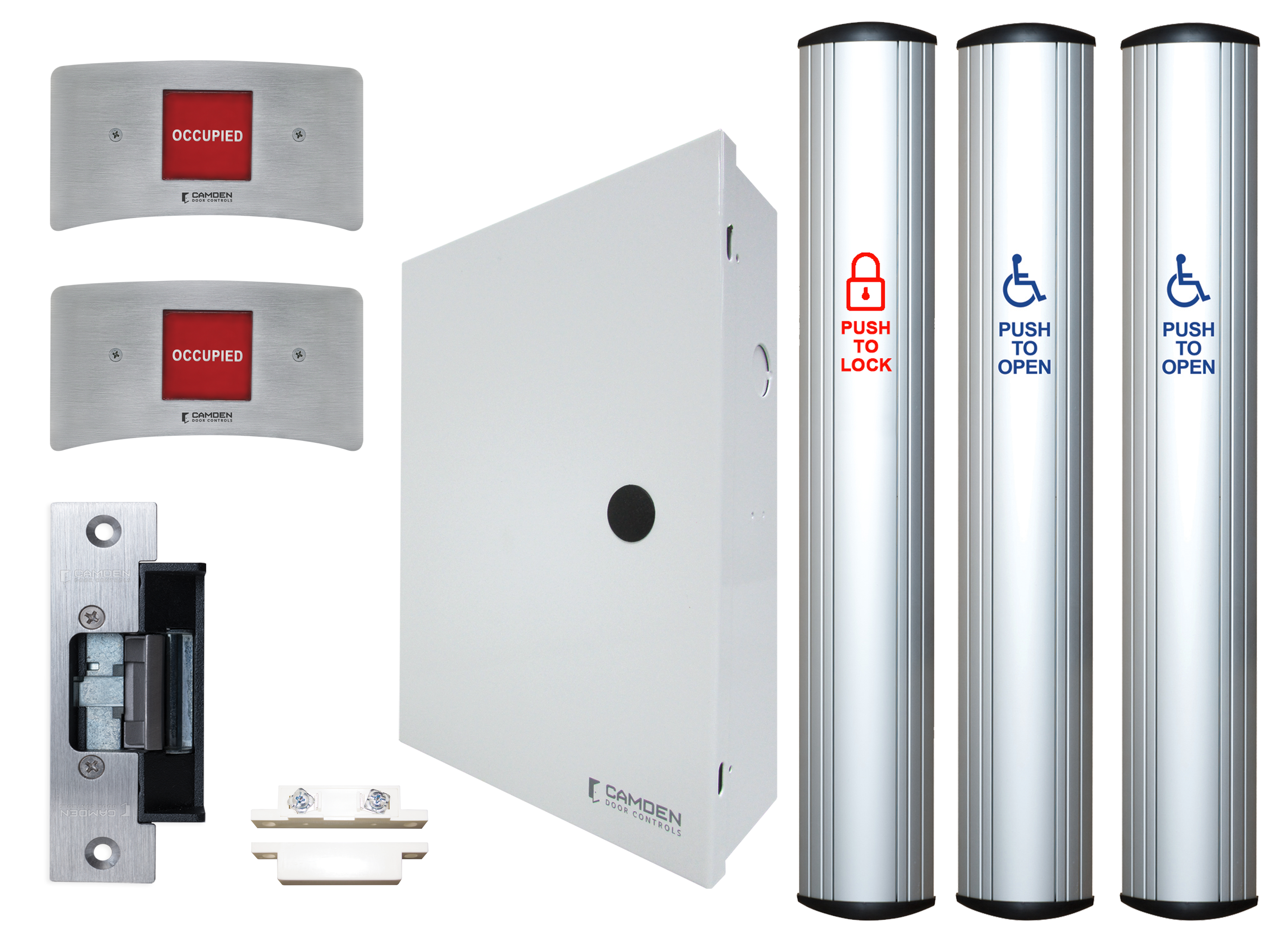 Sistema de baño de dos puertas de montaje empotrado CX-EMF-2 también ofrece la opción de desbloqueo temporizado e iluminación del anunciador estroboscópico.